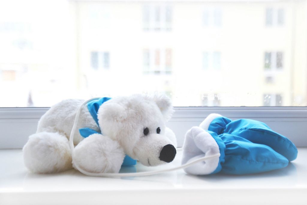 Weißer Teddybär mit blauem Dreieckstuch vor gleichfarbigen Baby-Fausthandschuhen auf weißem Fensterbrett