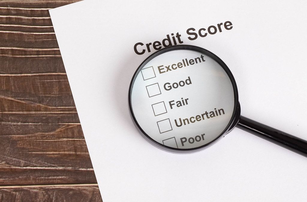 Weißes Papier mit Kreditscore-Ergebnissen unter einer Lupe auf einem Holztisch