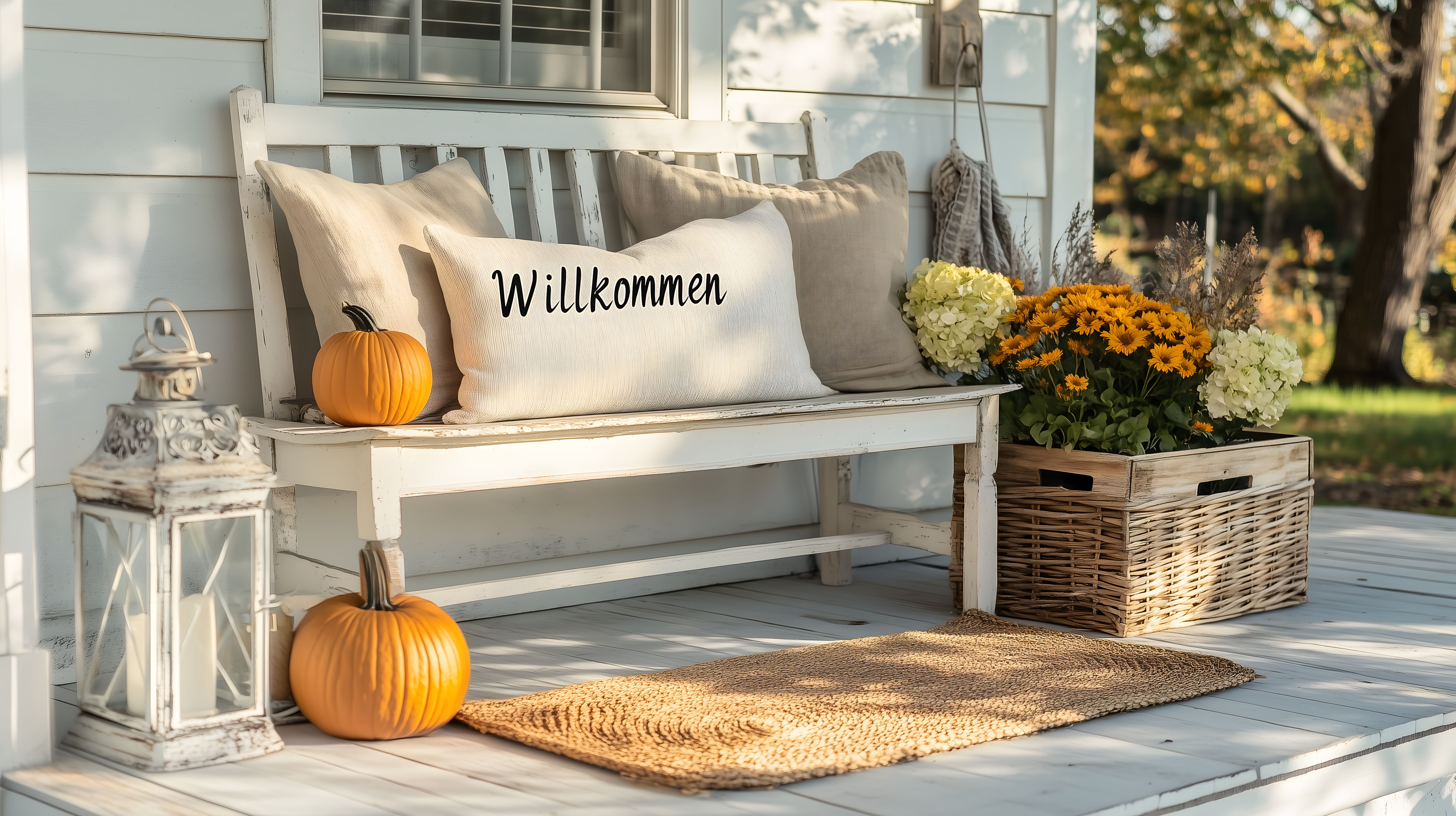 Willkommen: Veranda im Landhausstil mit Kürbissen und herbstlicher Dekoration