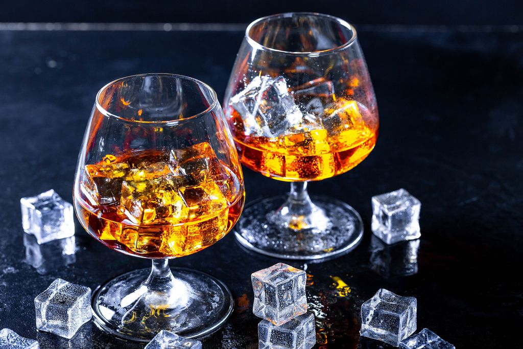 Zwei Cognacgläser mit Eiswürfeln auf dunklem Untergrund
