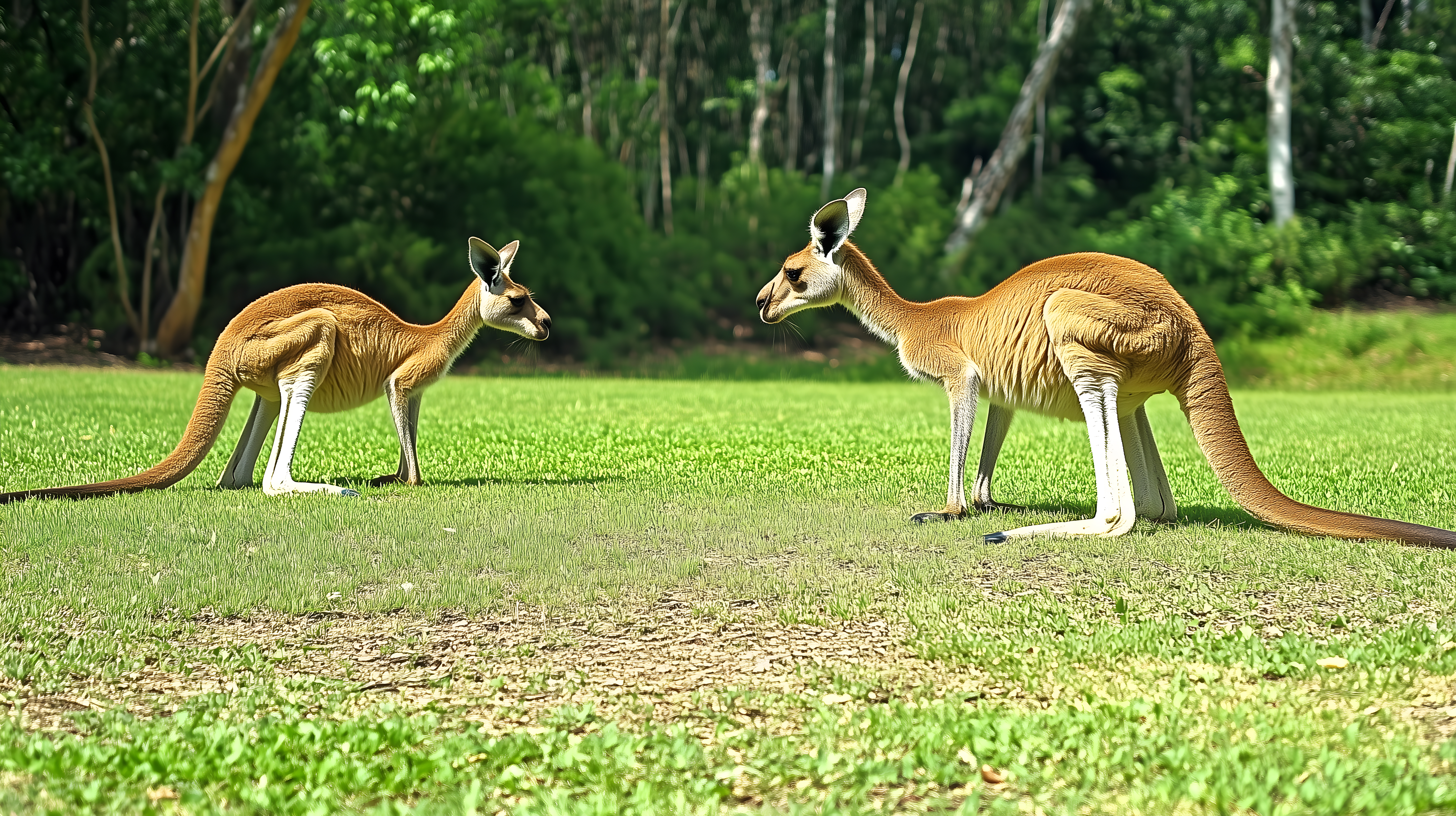 Zwei Kängurus auf einer grünen Wiese in Australien