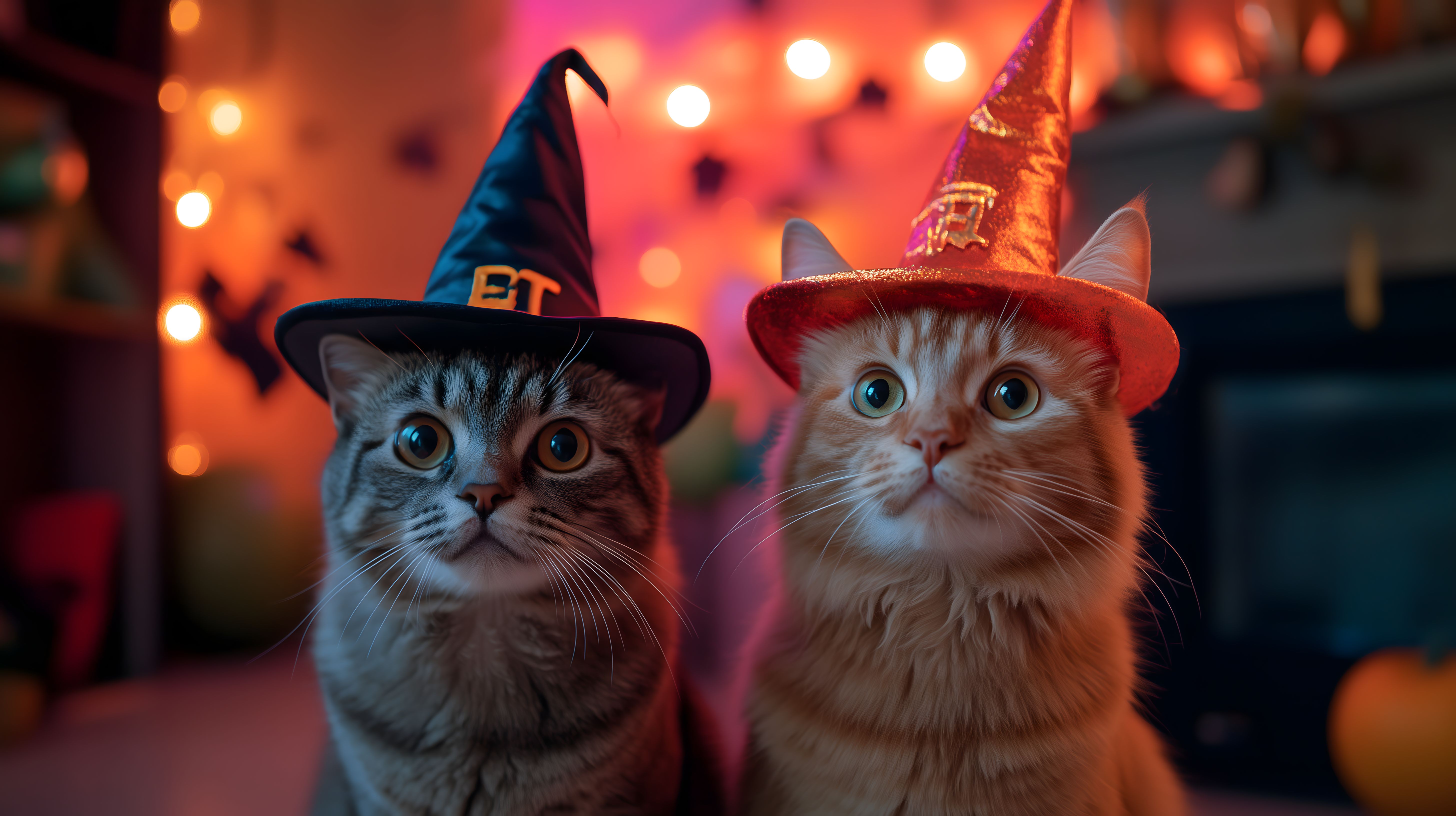 Zwei Katzen mit Hexenhüten und Halloween-Dekorationen